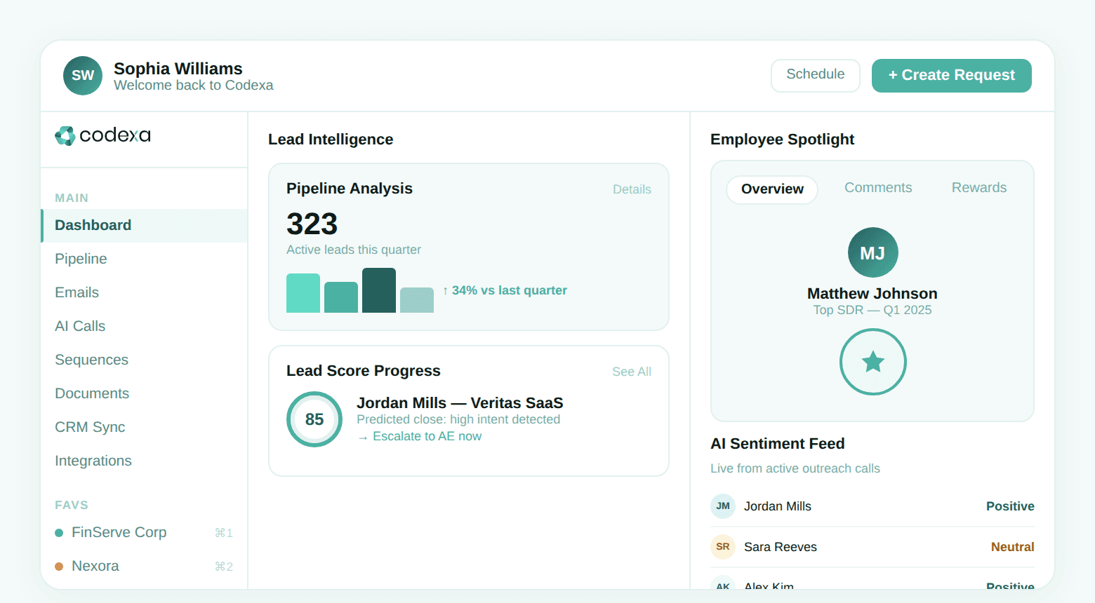Codexa doesn't wait for instructions — it reads the room. It scores every lead, detects sentiment from voice and text, forecasts where the pipeline is heading, and decides the next move on its own.